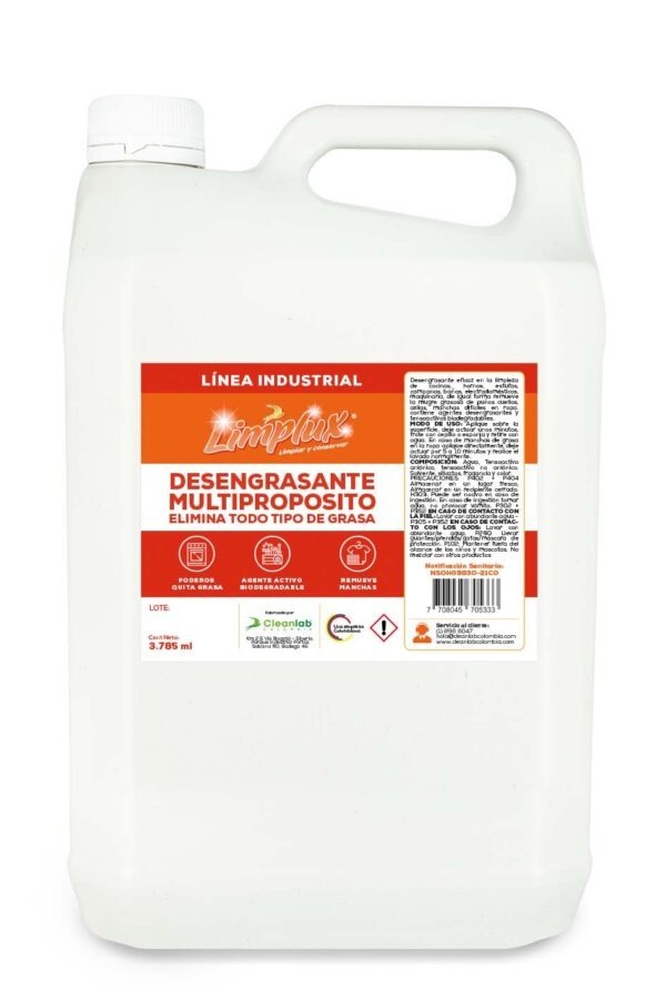 Eficaz en la limpieza de todo tipo de grasa que se puede presentar en todas las industrias, sector horeca, instituciones en general, hogar, remueve la mugre grasosa de puños cuellos y axilas, contiene potentes agentes desengrasantes y tensoactivos biodegradables